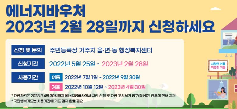 정부는 한국지역난방공사, 한국에너지공단과 함께 지역난방 소외계층 난방비 지원 현황을 검토하고 향후 대책을 논의하겠다고 밝혔다. 따라서 올해 2월 28일까지 소외계층 에너지바우처 신청해당되시는지 확인 부탁드립니다.