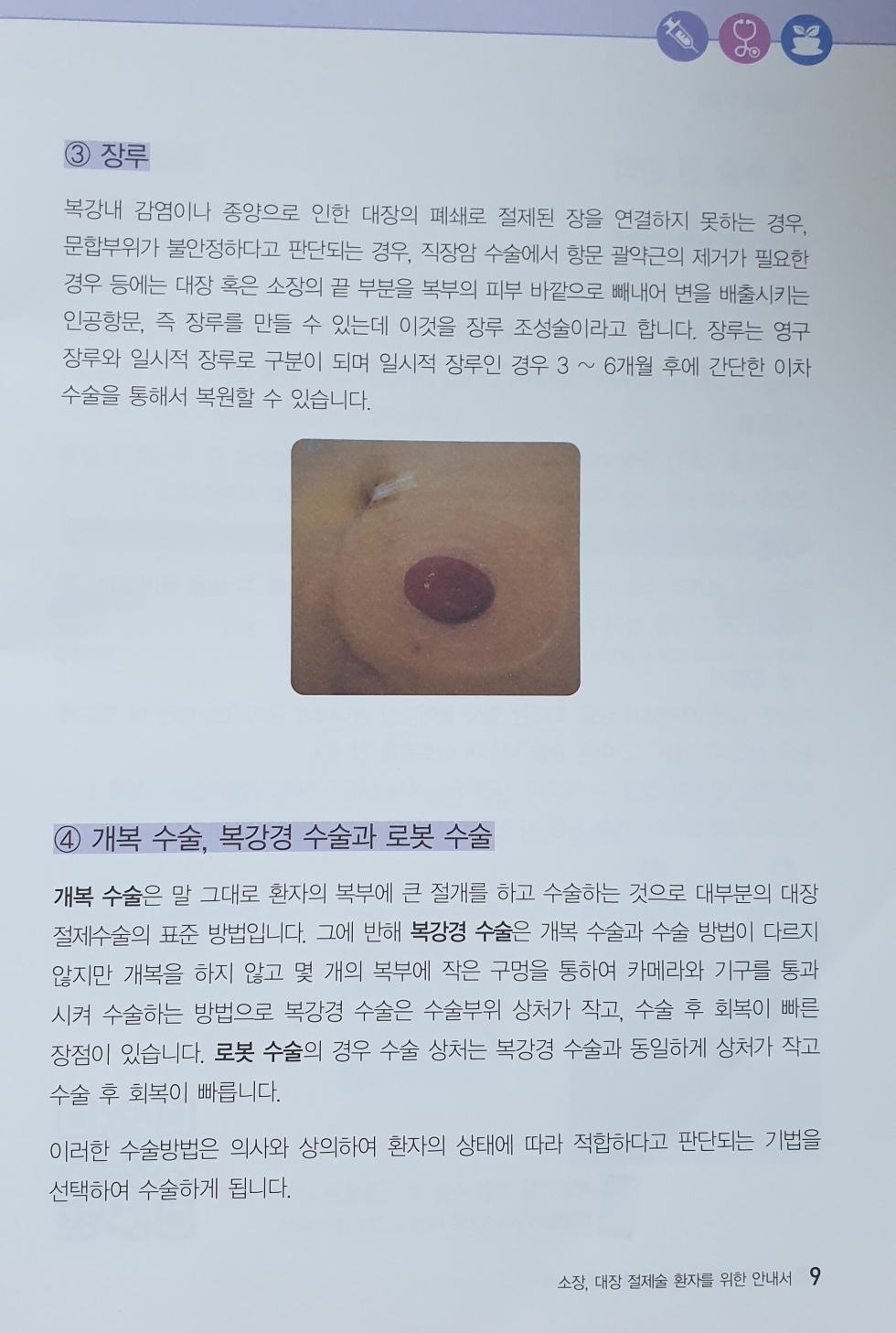 “회장루”는 수술적 문합 부위에서 대변의 누출을 방지하기 위해 하부 직장암의 경우 하부 전방 절제술 및 림프절 절제술 후 소장 말단의 회장에 일시적으로 개구하는 것입니다. 이것은 결장루(colostomy)를 시행하는 수술이고, “장루 수리”는 회장루 수술 후 6개월 후에 장루를 제거하고 절제된 회장과 대장을 다시 연결하는 시술입니다.