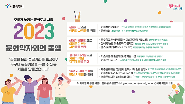 서울시가 경제적·물적 여건과 상관없이 누구나 문화예술을 즐길 수 있도록 ‘문화소외계층과의 동행’을 시작합니다. 청년 무료공연, ‘공연 봄날’, 세종문화회관 ‘천원의 행복’, ‘서울청년문화패스’ 등 다양한 사업으로 약 63만명이 혜택을 받을 전망이다. 올해 데뷔.
