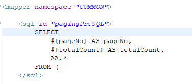 2. 다른 파일에서 쿼리를 가져와서 사용하려면, 해당 매퍼 ~의 네임스페이스 체이닝으로 작성해주세요. COMMON.pagingPreSQL처럼 쓰기