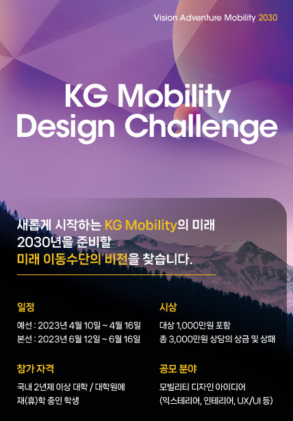 디자인 공모의 주제는 ‘비전 어드벤쳐 모빌리티 2030’이며, 쌍용자동차는 KG그룹과 만나 정통 SUV 브랜드의 헤리티지를 계승 발전시키기 위한 2030년 미래 비전을 설계하기 위해 ‘KG 모빌리티’라는 새로운 이름으로 쌍용자동차와 박사과정 학생을 배출했다. 참가 가능하며, 개인 또는 4인 이하의 팀으로 응모할 수 있습니다.