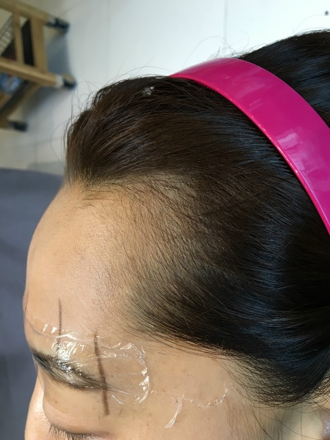 M자에 움푹 파인 부분 때문에 전반적으로 이마가 넓어 보여서 조금 좁아졌으면 해서 알아보고 리안채움에 방문해주셨다고 합니다. [BEFORE] – 30대 기혼여성 헤어라인 타투 시술 전 모습 –